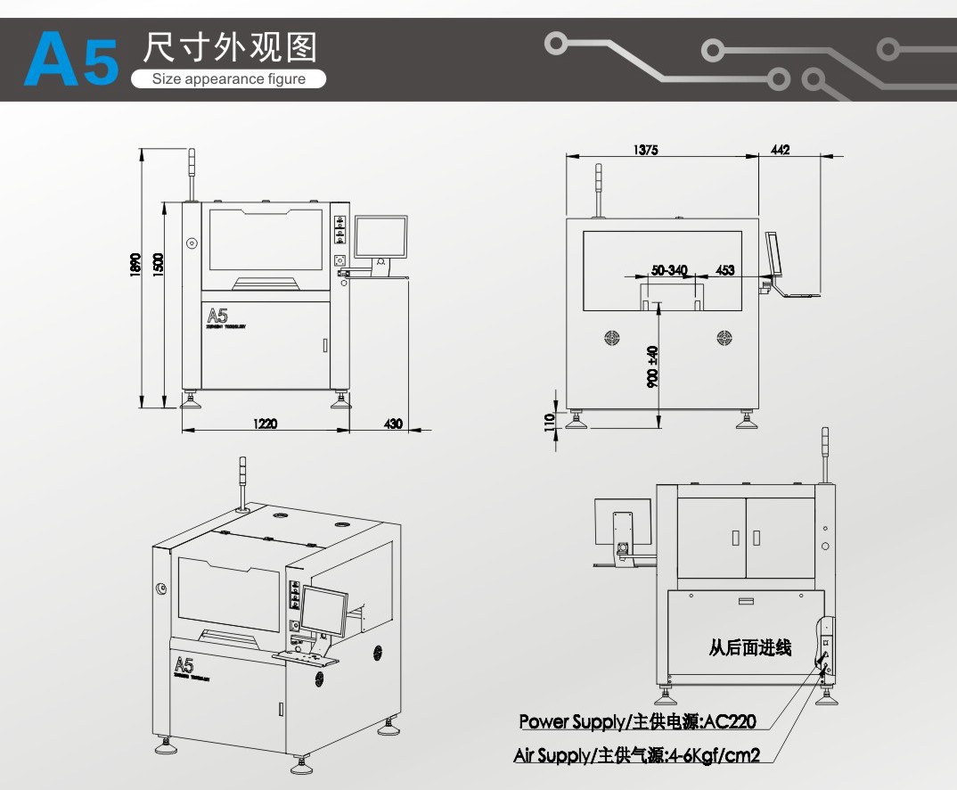 A5系列是一款高精度全自動(dòng)錫膏印刷機(jī)(High?PrecisionAuto?Paste?Printer)。在表面組裝工藝生產(chǎn)(SMT)中,用于高精度的鋼網(wǎng)印刷或漏版印刷的專用生產(chǎn)設(shè)備。